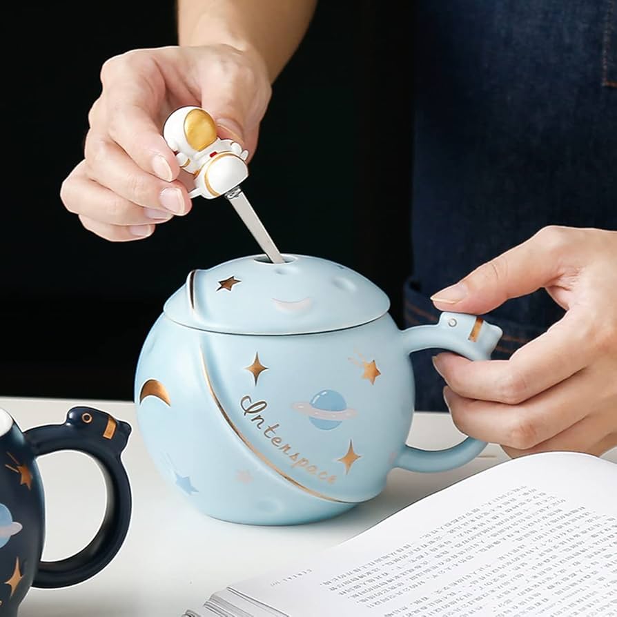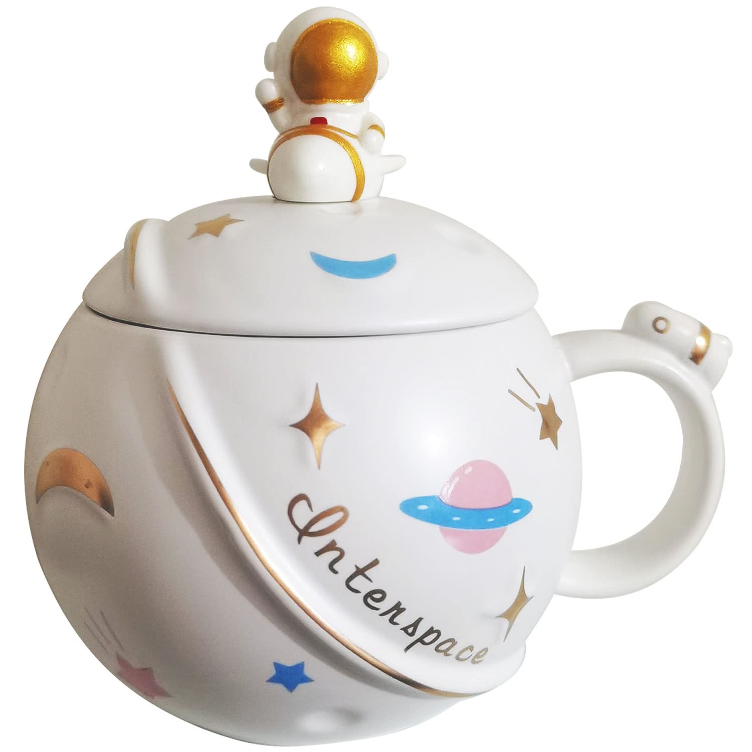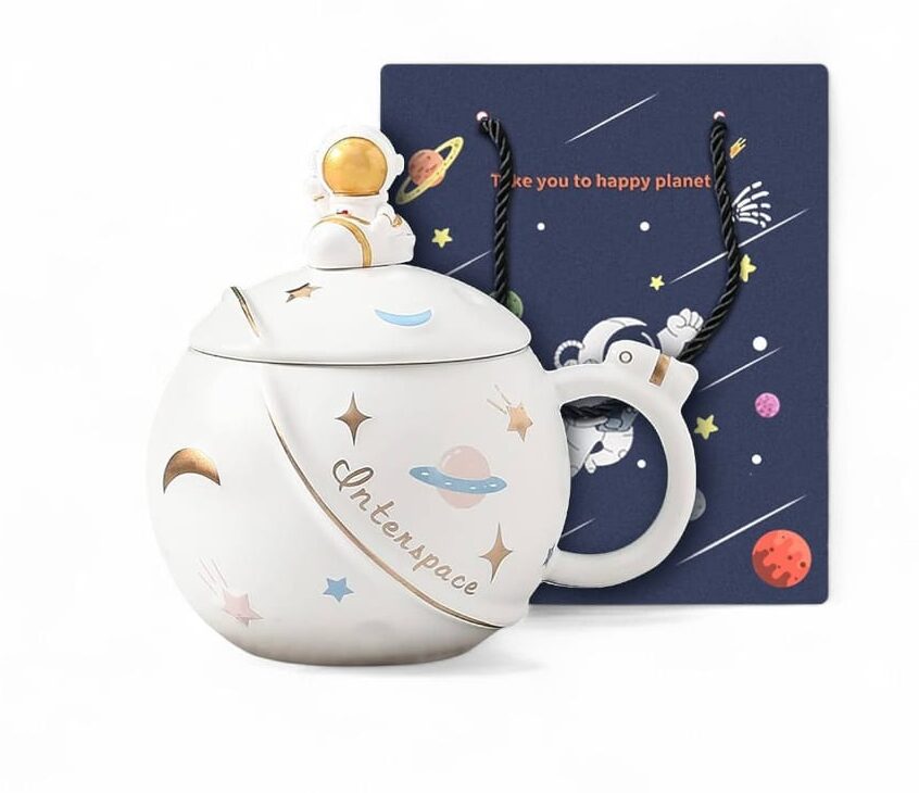 MOON AND ASTRONAUT MUG, TWO COLORS WHITE AND PINK, WITH SPOON AND MUG LID IN A GIFT BOX.